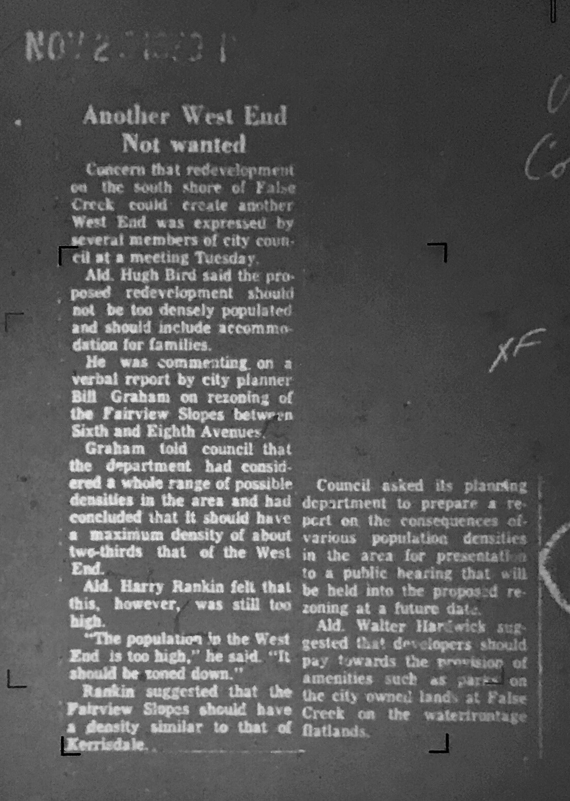 Fairview Slopes underwent a major rezoning in the early 1970s. During the planning process, negative comparisons to the West End were very common. Common concerns: too dense, not suitable for families, and too expensive.