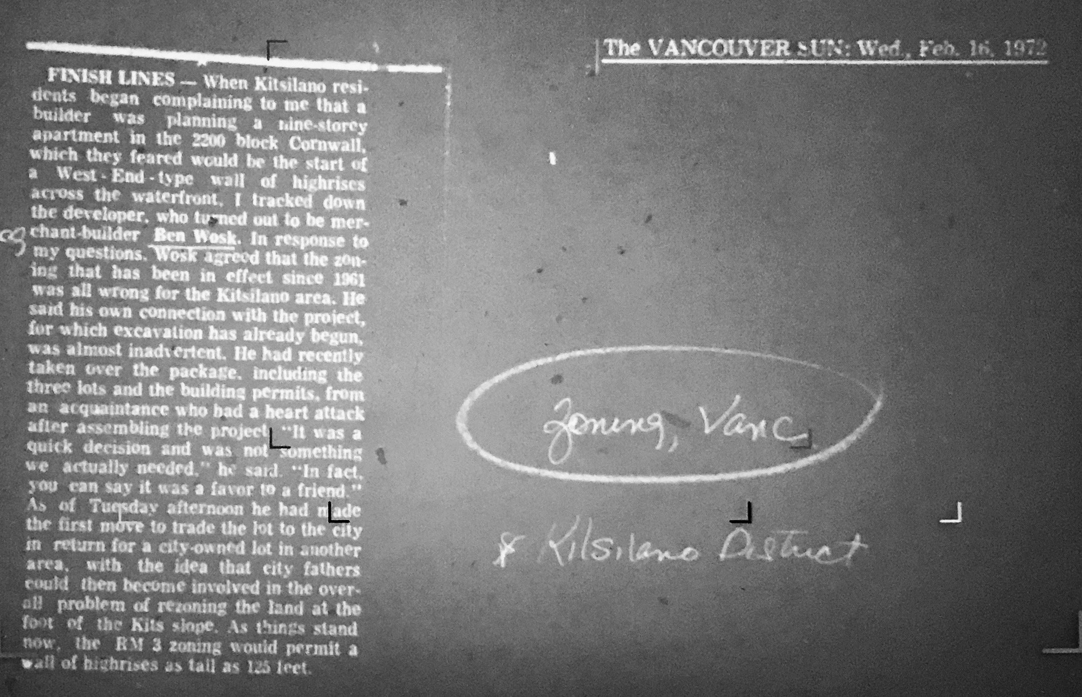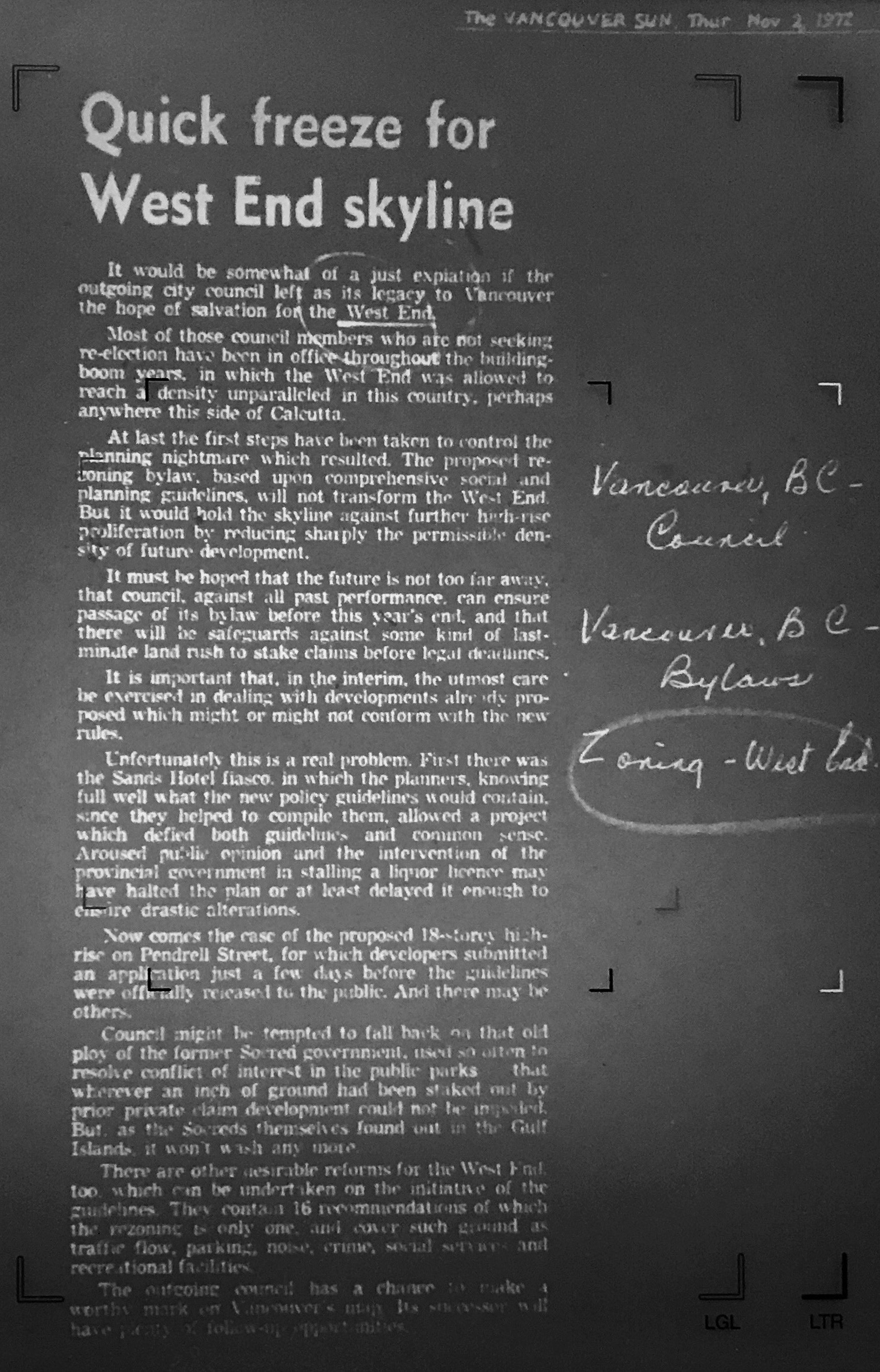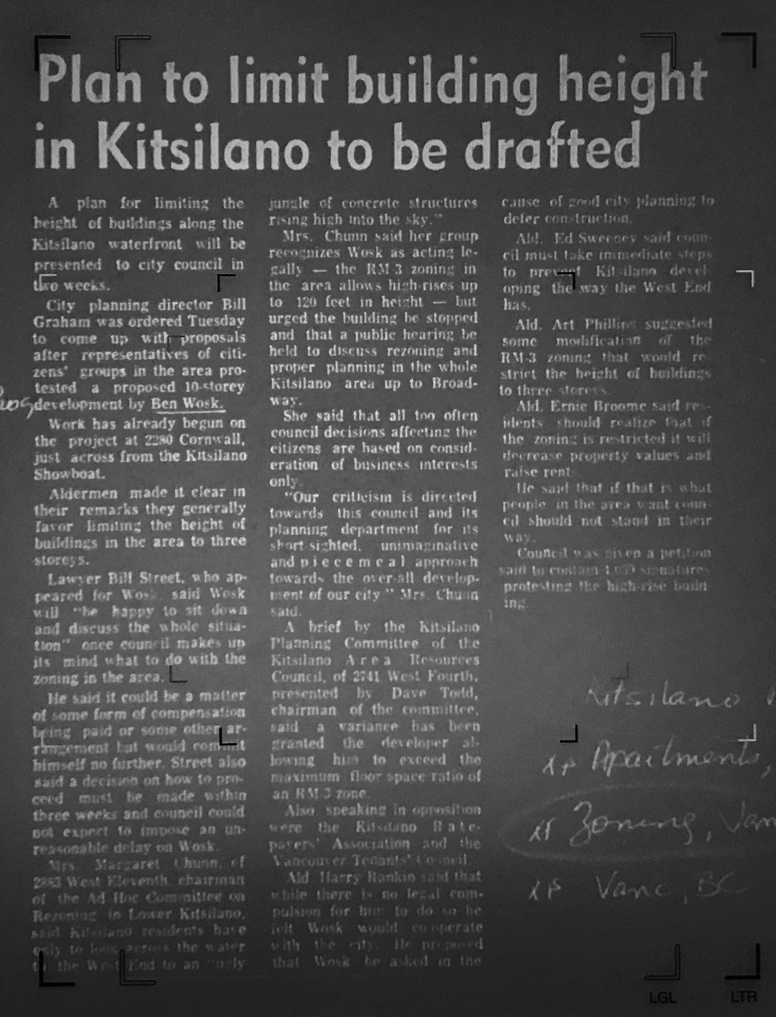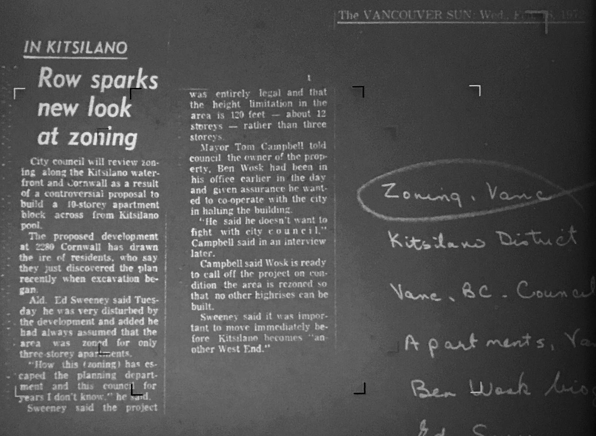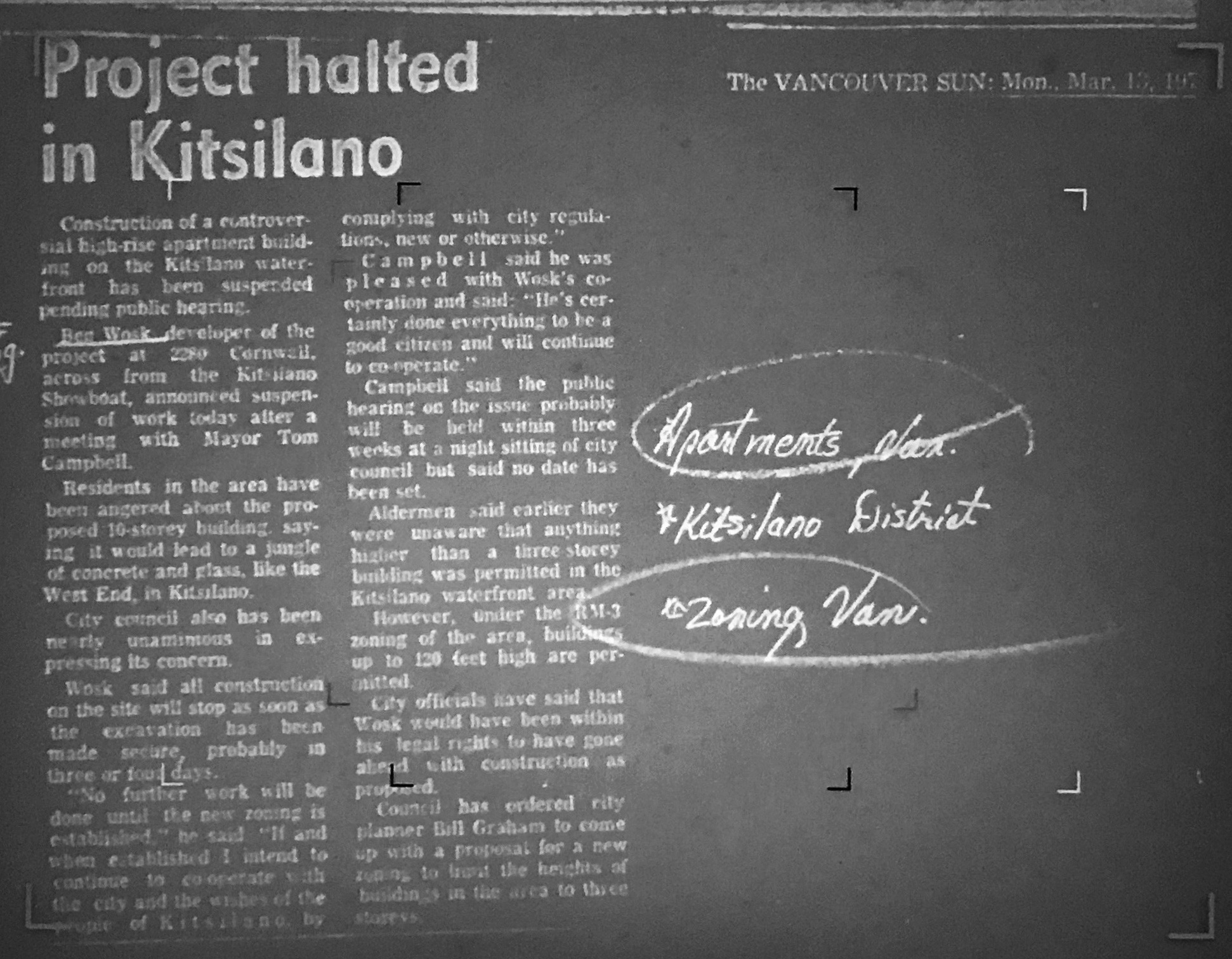All articles were found on microfiche at the Central Vancouver Public Library in the Pacific Press newspaper clippings, subject “zoning”. Some clippings did not specify the newspaper, but the Vancouver Sun or Province are safe bets.