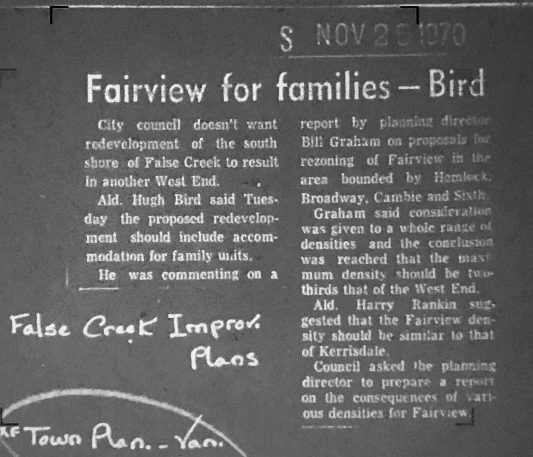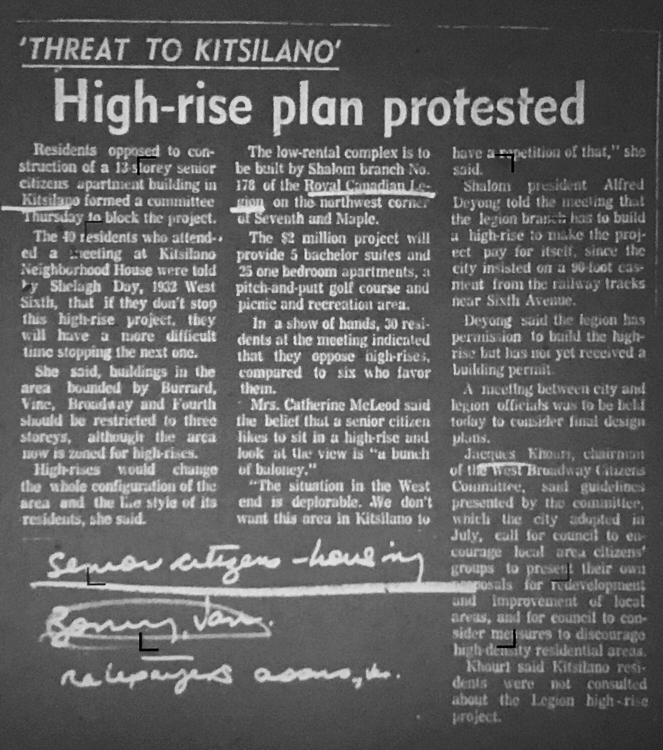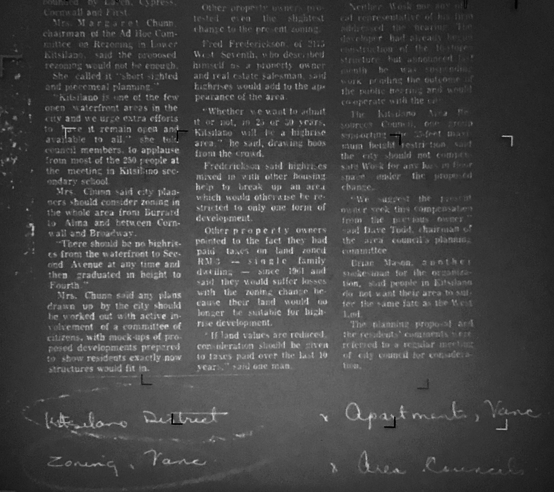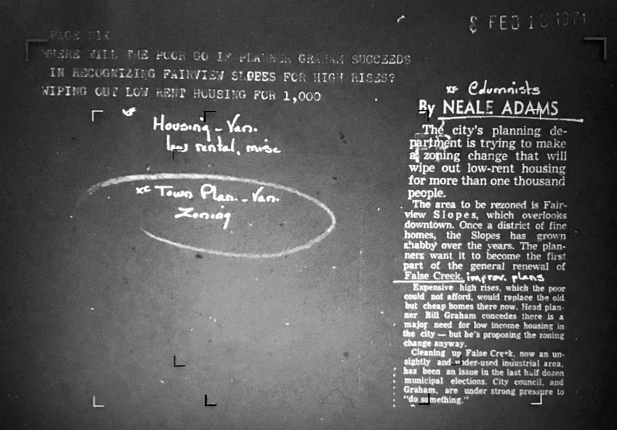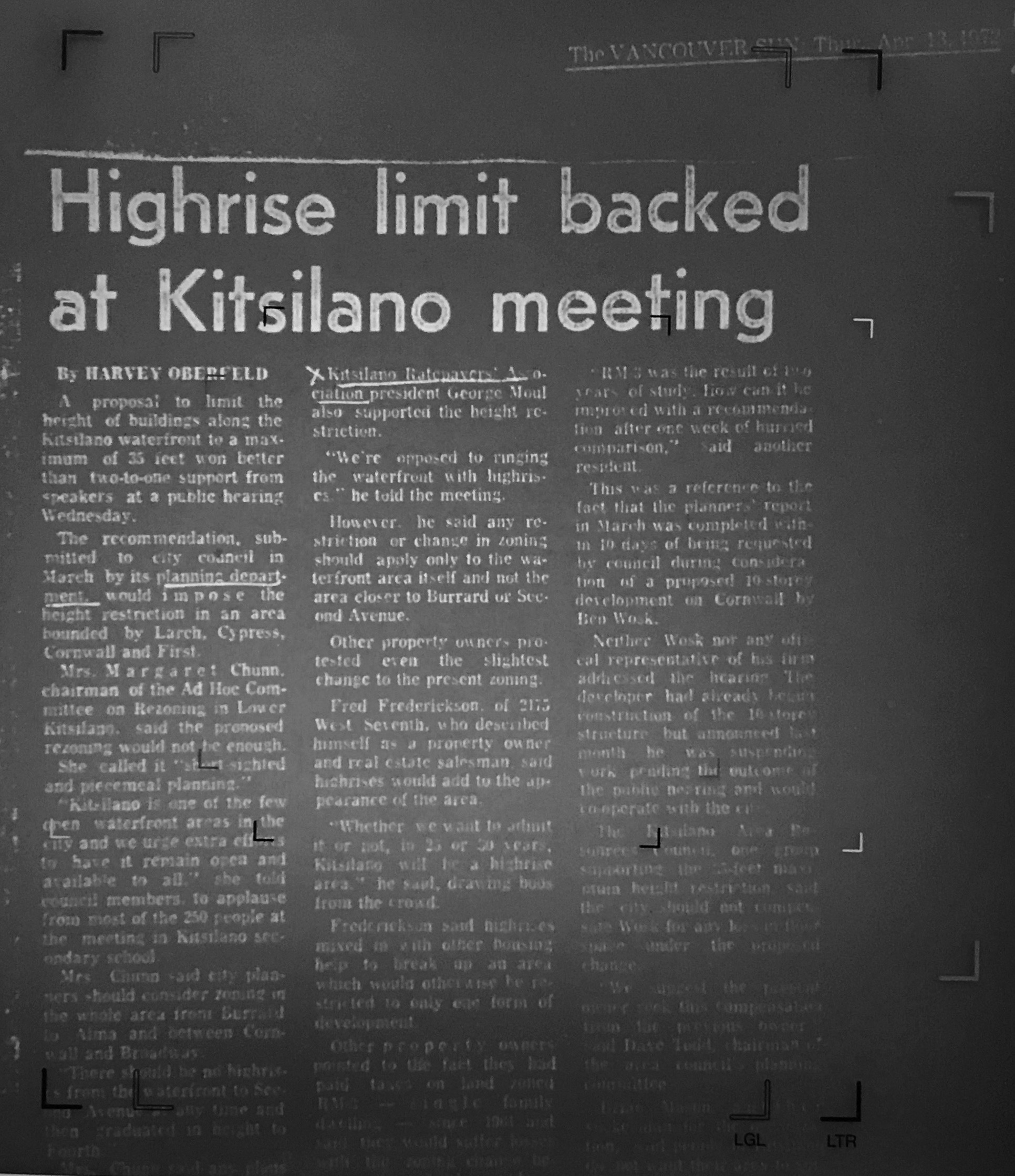 All articles were found on microfiche at the Central Vancouver Public Library in the Pacific Press newspaper clippings, subject “zoning”. Some clippings did not specify the newspaper, but the Vancouver Sun or Province are safe bets.