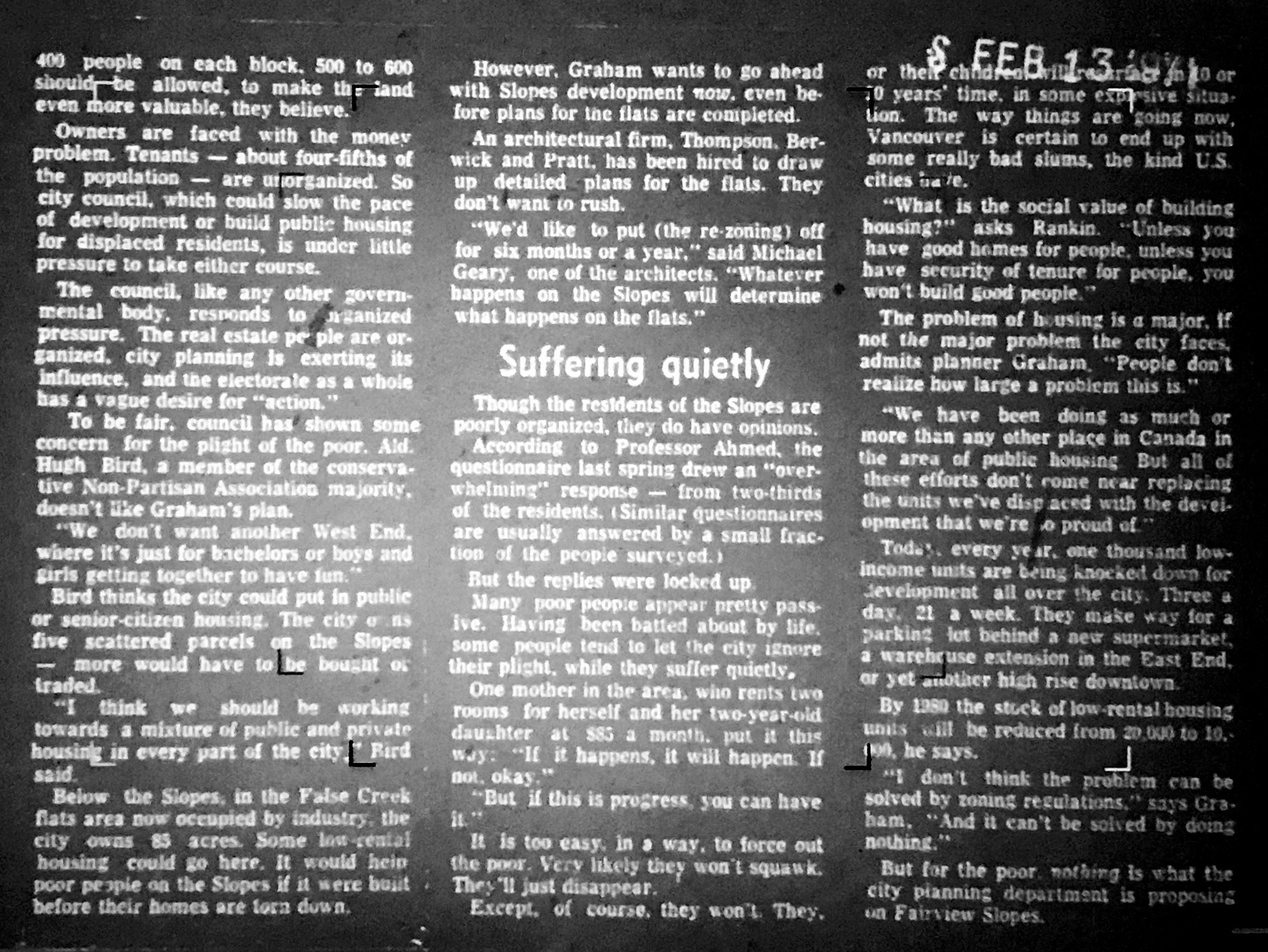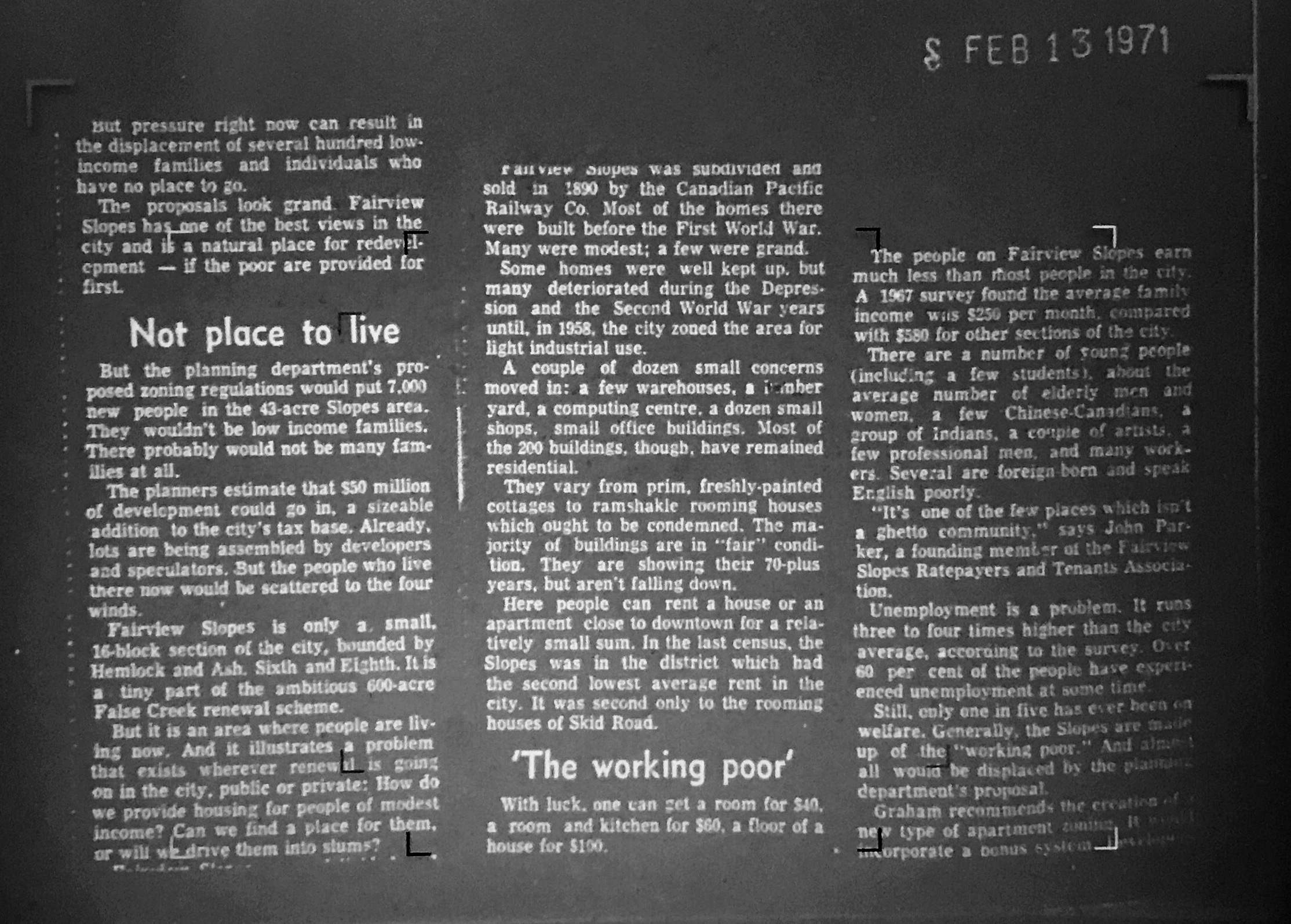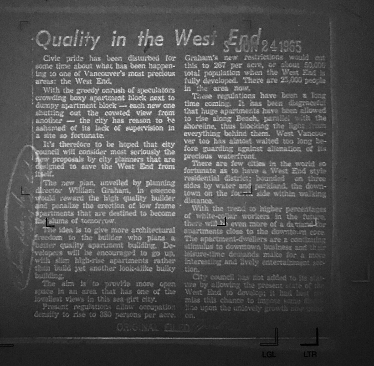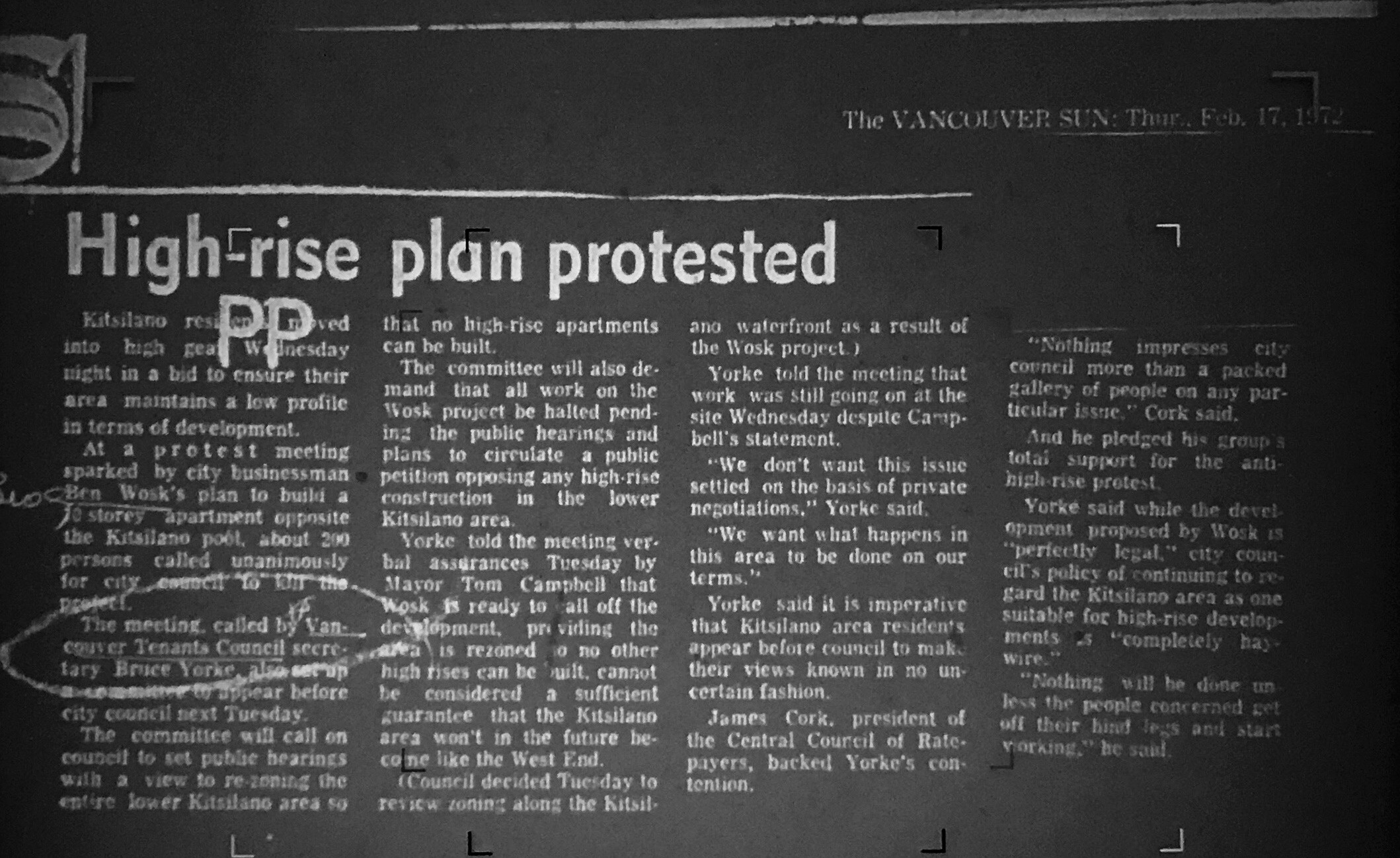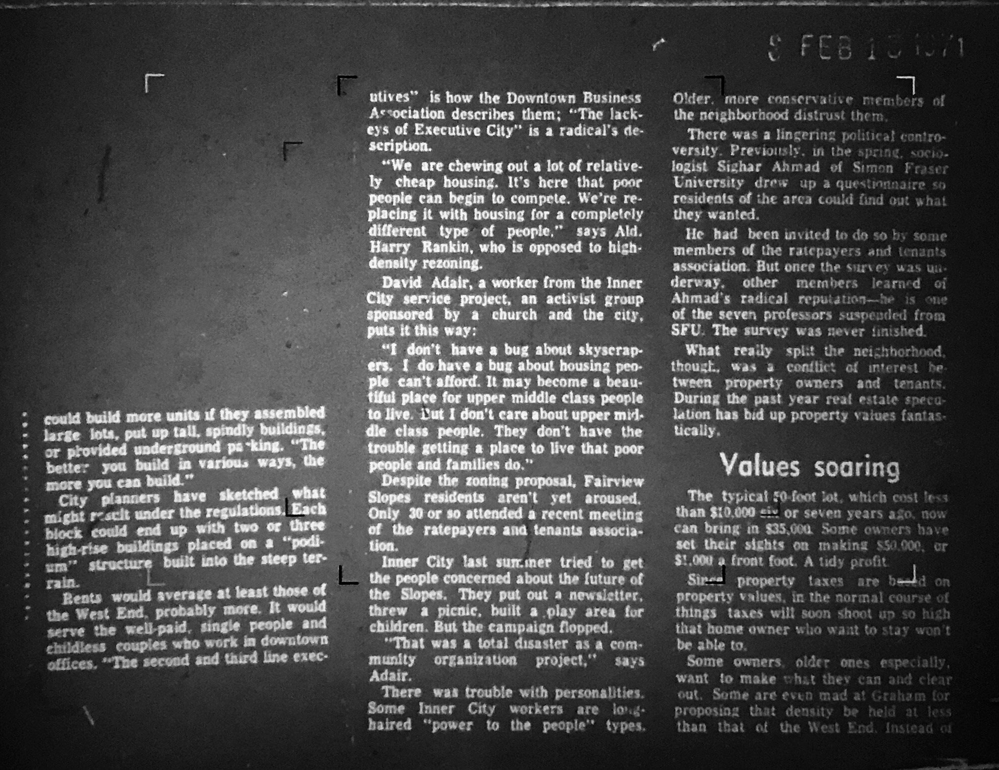 All articles were found on microfiche at the Central Vancouver Public Library in the Pacific Press newspaper clippings, subject “zoning”. Some clippings did not specify the newspaper, but the Vancouver Sun or Province are safe bets.