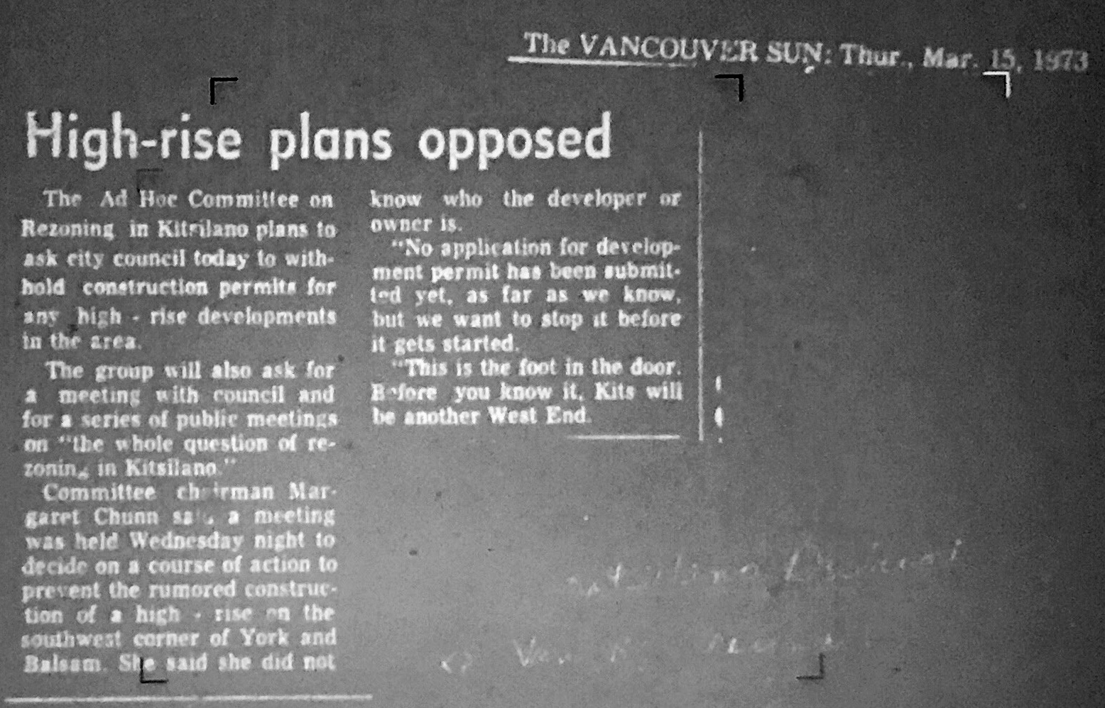 ‘Threat to Kitsilano’ High-rise plan protested (Vancouver Sun, Aug 17 1973)